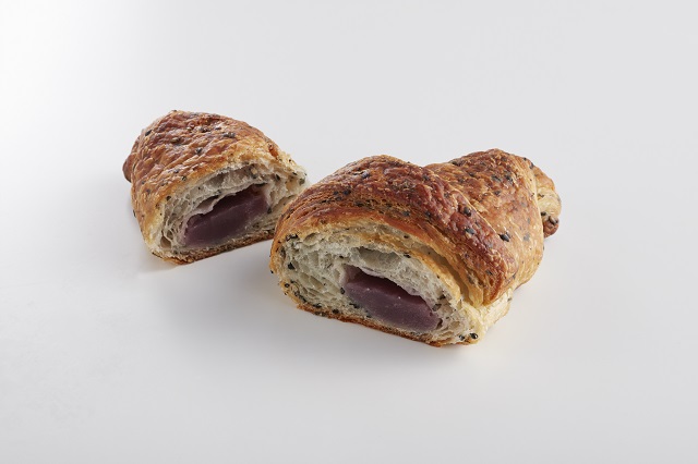 国産ごまのクロワッサン生地の中に、国産原料で作った三日月屋特製の紫いも餡を包み込んだクロワッサン(約65g/1個)